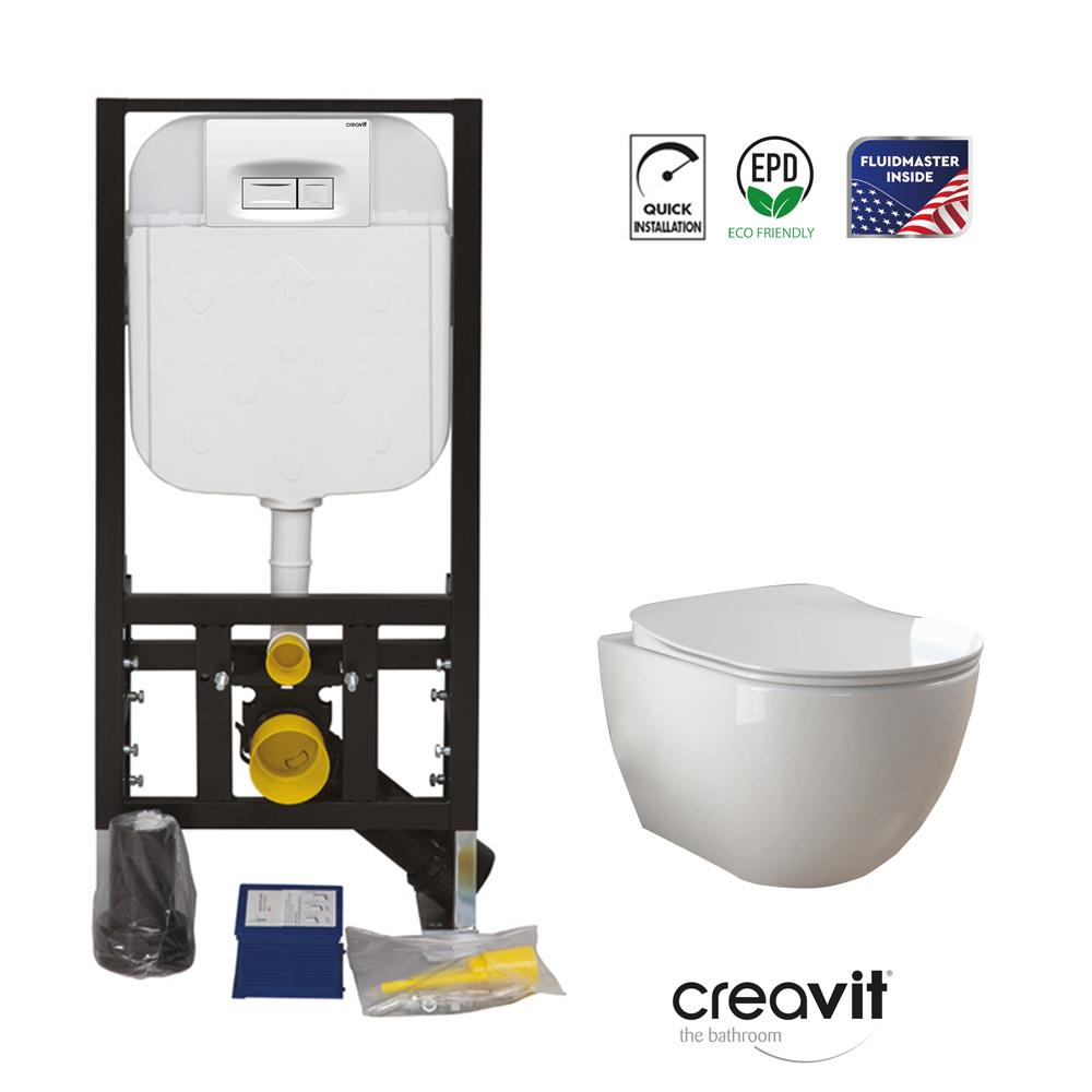 Επίτοιχη εγκατάσταση, στερέωση σε φέροντα τοίχο. Ρυθμιζόμενο ύψος σωλήνα τροφοδοσίας λεκάνης. Αθόρυβο φλοτέρ, με σύνδεση παροχής νερού εξωτερική για αποφυγή διαρροής.