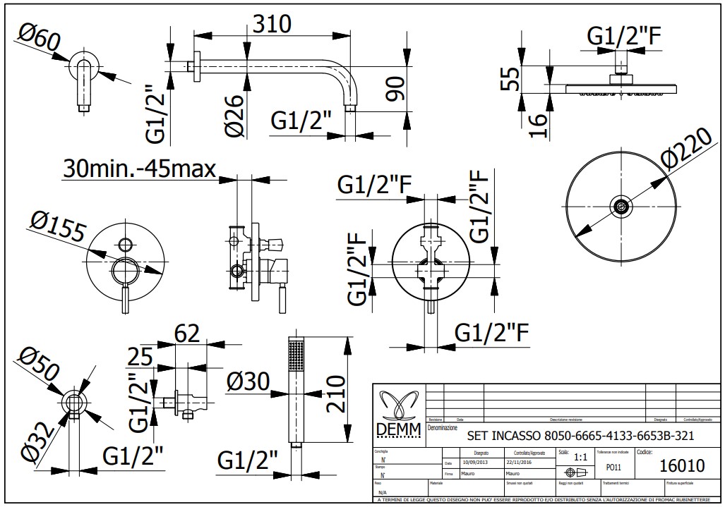 Σετ εντιχοισμού με μίκτη, βραχίονα, κεφαλή ντούζ Ø20, τηλέφωνο ντούζ, σπιράλ & παροχή με βάση στήριξης