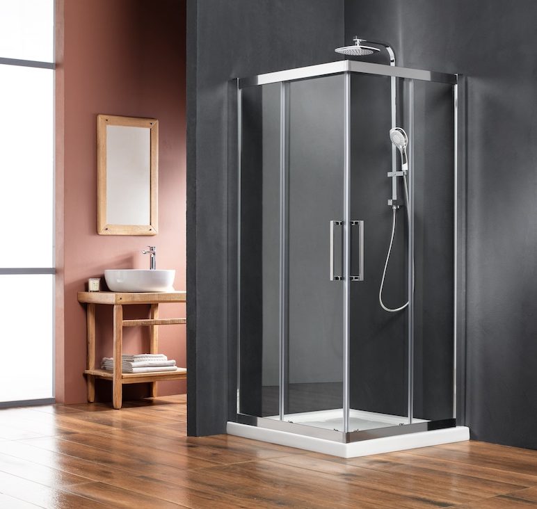 Βαρέως τύπου καμπίνα ντους, με δύο σταθερά φύλλα και δύο συρόμενες πόρτες.